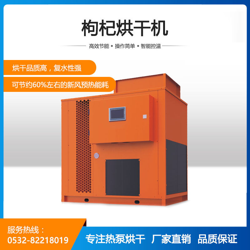 烘干機(jī)廠家生產(chǎn)的枸杞烘干機(jī)主要工作原理是:利用冷媒經(jīng)過壓縮機(jī)做功,生成高溫高壓的氣體,然后進(jìn)入冷凝器,冷凝液化放熱,用于烘干房空氣加熱,從而提供烘干房溫度。通過熱風(fēng)的形成使枸杞烘中的水分汽化蒸發(fā),蒸發(fā)出來的水蒸氣由排濕系統(tǒng)排走,從而達(dá)到烘干杞烘的目的。同時排濕系統(tǒng)可采用熱回收裝置,回收的熱量用于加熱新風(fēng),可節(jié)約60%左右的新風(fēng)預(yù)熱能耗,從而達(dá)到節(jié)能的效果。